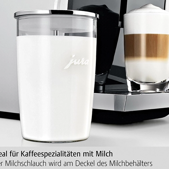 O recipiente comporta 0,5 litros e é perfeitamente harmonizado com as linhas típicas do design JURA. É fácil de lavar (pode ser lavado na lava-louças) e fácil de armazenar na geladeira e conectar à máquina de café quando necessário. A lança de leite é conectada apenas na altura certa para permitir que o leite seja colocado e espumado com facilidade.