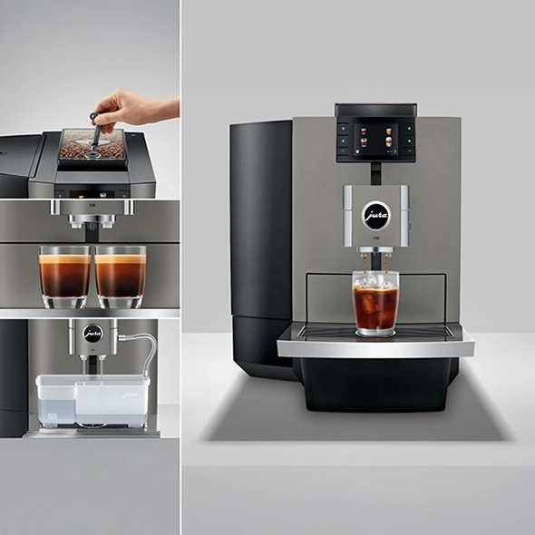 A máquina de café X10 oferece cold brews com o toque de um botão, ideal para escritórios e áreas de autoatendimento. Utilizando o Processo de Extração a Frio da JURA, a água fria passa pelo café recém-moído sob alta pressão, resultando em uma bebida fria natural e energizante.